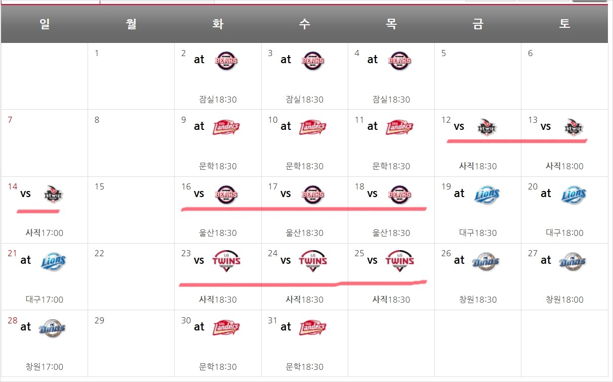 위 달력은 7월 중 롯데자이언츠의 경기 일정을 담은 달력입니다. 빨간색 밑줄 친 부분이 롯데 자이언츠의 홈 경기 일정입니다.
