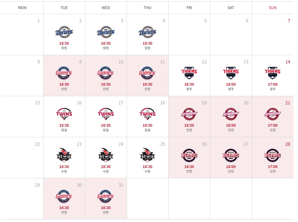 달력 중 빨간색으로 표기 된 부분이 SSG랜더스의 홈경기 구장인 문학구장에서 열리는 경기 입니다.